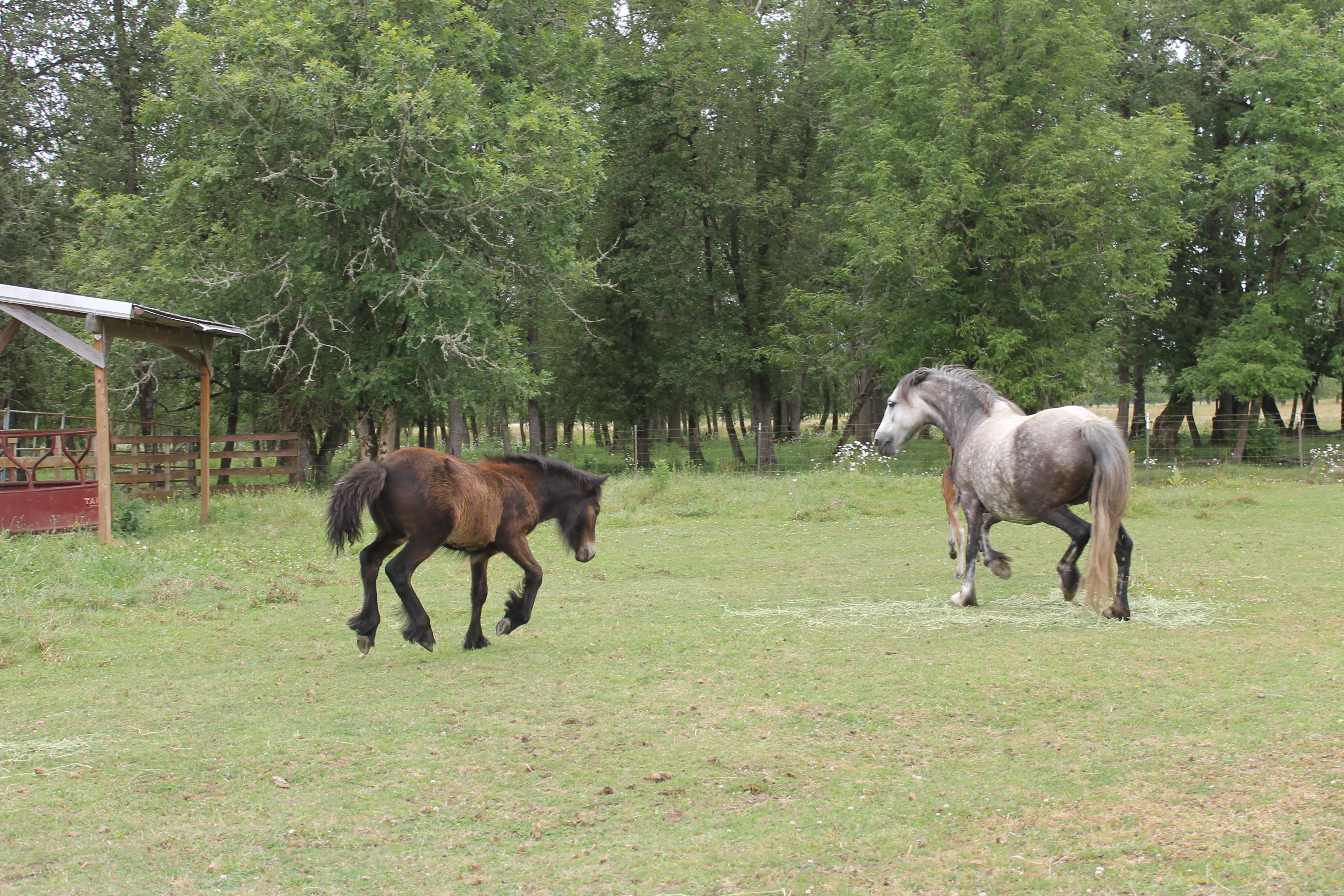 In motion letting Fiddlehead Catalina know her filly Faustina is not ready to interact.
